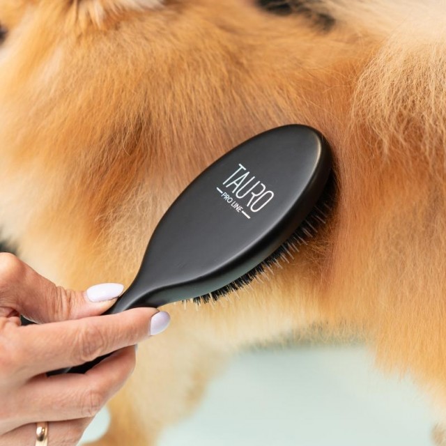 Tauro Pro Line Prestige Collection Beechwood Brush med nylonpigger og naturbust (villsvinbust) er et førsteklasses groomingverktøy utviklet av profesjonelle groomere for lange og tette pelstyper. Børsten kombinerer effektiv flokeløsning med skånsom pleie og passer perfekt til små, mellomstore og store kjæledyr.