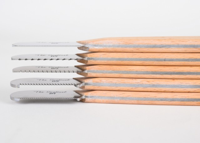Materialene som brukes er en høykvalitets metallegering som er sterkere og lettere enn andre kniver – hver kniv veier under 30 gram. Bøketreet som brukes til å produsere håndtakene kommer fra bærekraftige europeiske skoger og lakken er FCS-godkjent som en sikker A+ for miljøet.