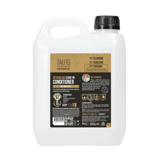 Denne leave-in balsamen er det siste steget i Tauro Pro Line’s tre-stegs system for pelspleie. Det gir fuktighet, fikserer resultatet og etterlater pelsen lett å børste og fri for frizz. Perfekt for både hunder og katter, og passer for alle pels- og hudtyper.