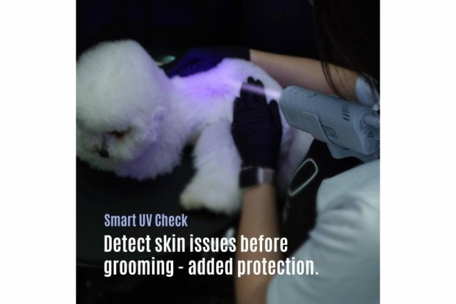 Tørk jevnt: Beveg luftstrømmen rolig over pelsen for å unngå overoppheting av ett enkelt område. Bruk eventuelt UV-lyset for ekstra renslighet.